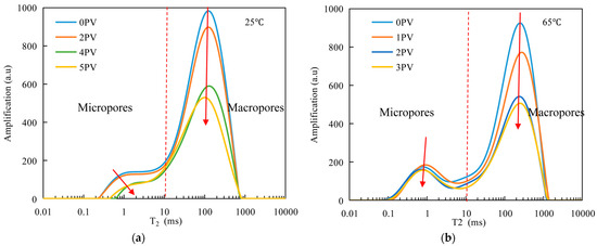 Figure 9. T2 spectrum in nanoemulsion injection changed with PV at different temperatures: (a) 25 °C; (b) 65 °C. (The red dashed line is the boundary between large and small pores, and the arrow is the direction of the peak change of the T2 spectral line).