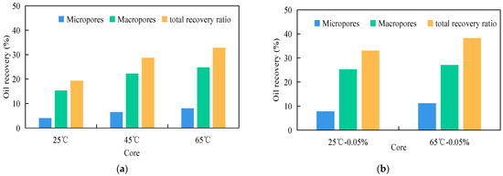 Figure 10. Comparison of oil recovery for different core samples: (a) water injection; (b) nanoemulsion injection.