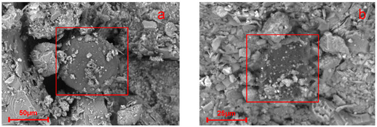 Figure 12. The SEM image of wax precipitation: (a) remaining oil morphology after waterflooding at 25 °C; (b) remaining oil morphology after waterflooding at 65 °C. (The red box shows the shape of the detected crude oil).