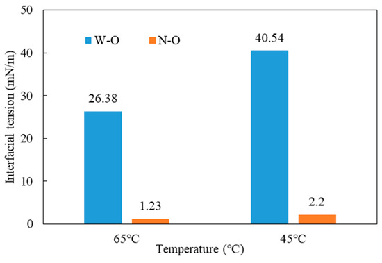 Furthermore, the oil–water interfacial tensions (IFT) of nanoemulsion and water at different temperatures are measured using the du Noüy ring method. Figure 14 shows the results of the interfacial tension, indicating that the higher the temperature, the lower the interfacial tension, and the addition of nanoemulsion can further reduce the interfacial tension. When the temperature is increased from 45 to 65 °C, the IFT is decreased from 26.38 mN/m to 40.54 mN/m. Compared to this, adding nanoemulsion can effectively reduce the IFT. And the enhancement of IFT reduction increases with the decrease in temperature. This is the reason why nanoemulsions have a better performance when they are used at lower temperatures. The reduction in IFT can decrease the flow resistance in the porous medium and thus mobilize more remaining oil therein. Combining IFT reduction and wettability alteration, nanoemulsion can improve the oil recovery of high-wax oil reservoirs as the temperature gradually decreases to the wax precipitation point.