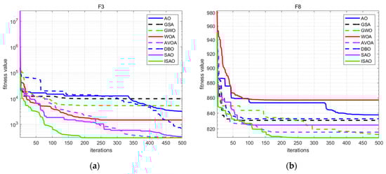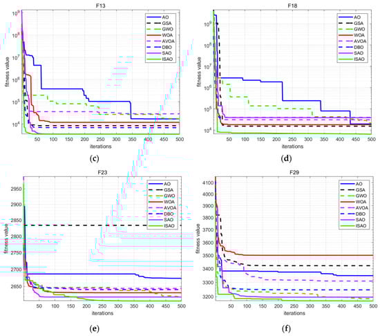 Fitness values of different algorithms. labels (a–f) display the fitness value iteration curves of different optimization algorithms applied to the test functions F3, F8, F13, F18, F23, and F29, respectively.