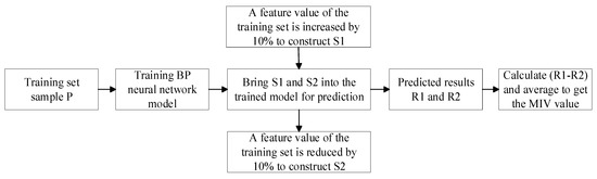 Since the MIV algorithm needs to be combined with a neural network to realize feature screening, a back propagation neural network (BP) was selected in this paper. Firstly, a BP model was constructed using the training samples. Secondly, each feature in the training sample was increased or decreased by 10% on the original basis to form two new training samples. Finally, the BP model was used to predict and calculate the new sample data. The MIV value of the feature on the output was obtained by arithmetically averaging the difference between the two results, which reflects the influence of the feature on the output after proportional increase or decrease. Figure 2 displays the specific flow chart.
