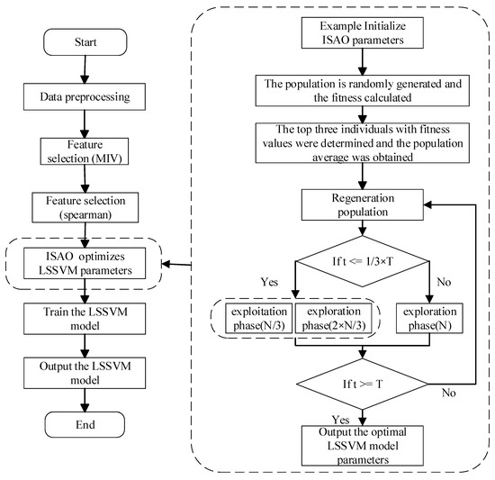 After determining the optimization parameters and fitness function, the ISAO algorithm was used to establish the LSSVM prediction model, as shown in Figure 3.