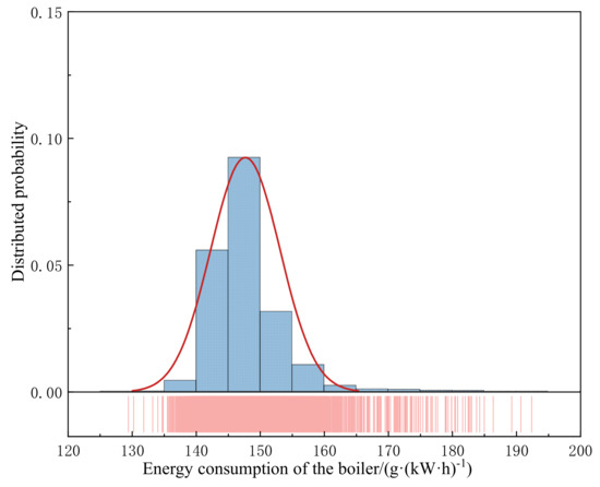 The accuracy of the measuring instrument and means affects the unit’s data, leading to potential errors. These errors can increase model inaccuracies and weaken the effectiveness of data mining. Therefore, it is crucial to clean abnormal data before establishing an energy consumption prediction model. For instance, it was discovered that the coal feed measurement point of a coal mill was not 0 when the mill was shut down, but instead of being a small value. To rectify such clearly erroneous data, it was artificially modified to 0. In addition, using the unit operating at 606–607 MW as an example, there are 730 samples in this range. Figure 5 shows the distribution of energy consumption of the boiler system under this condition. It was discovered that the energy consumption of the boiler system differed due to the difference in its operating state and regulation mode, despite having a similar unit operating load. However, it can be assumed that the energy consumption of the boiler system follows a normal distribution under the same working conditions, with particularly high or low energy consumption being rare cases.