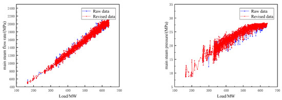 Based on the analyses above, the 3-sigma criterion was selected for outlier detection in this paper. First, the dataset was arranged in descending order according to the load order, and the interval was divided into intervals of 50 samples; then, the mean e and standard deviation μ of each interval were calculated, and the samples that were not in the range (e − 3μ, e + 3μ) were recorded as outliers; finally, to ensure continuity and coherence of the dataset, the Lagrange interpolation method was used to calculate a new value based on the two samples preceding and following the outlier. The outlier was then replaced with this new value. Taking the main steam flow rate and main steam pressure as an example, their distribution with unit load before and after data processing is shown in Figure 6. It can be seen that after clearing outliers, the distribution of data was more stable and concentrated, which is more in line with the actual trend.