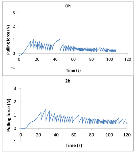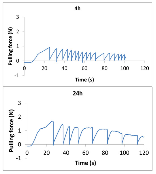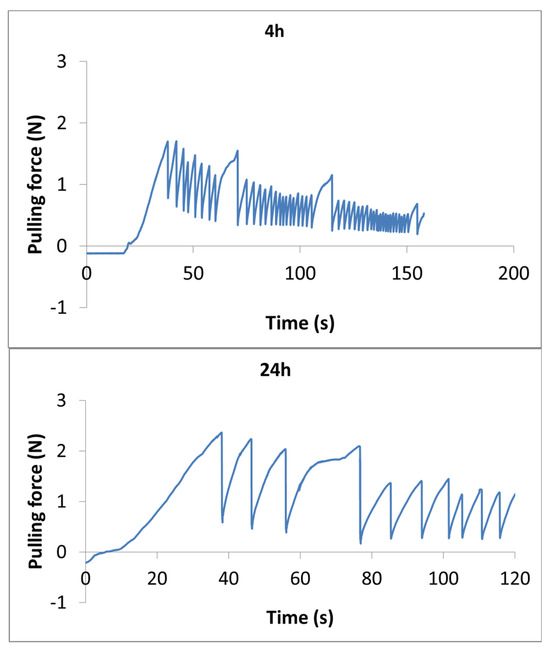 The evolutions of the pulling force over time, measured for wheat flour and potato starch consolidated at 90% ambient humidity under a pressure of 10 kPa within a time range from 0 to 24 h, are illustrated in Figure 1 and Figure 2. In the case of wheat flour, the pulling force gradually increased with the extended consolidation time, reaching more than twice the strength after 24 h compared to the measurement for the control sample. The differences in forces between control samples of potato starch and those subjected to a 24 h consolidation process were significantly smaller than those calculated for wheat flour. For potato starch, the increase in consolidation time from 0 to 4 h resulted in a negligible change in the pulling force.