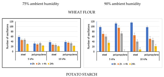 Contrary to wheat flour, potato starch exhibited a decreasing number of oscillations with increasing ambient humidity, indicating different mechanisms of interaction between materials of rod and these powders. The probable reason for such behavior is that its structure changes as a result of gelation, which affects functional properties such as thickening, stabilizing, or altering the texture. The more intensive water absorption by starch particles at higher ambient humidity resulted in an extended sliding time of starch particles in contact. Wajs et al. [20] did not observe such a trend for potato starch with a moisture content of 9.5%. These authors reported that, regardless of the consolidation load, the number of oscillations was 40 and 30 for the rod made of steel and polypropylene, respectively. These data were similar to the ones obtained in this study for an ambient humidity of 75%. Only an increase in humidity to 90% decreased the number of oscillations, indicating a slight impact of humidity on the number of oscillations in the tested samples until its critical value was exceeded.
