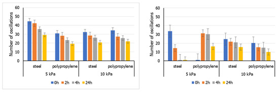 A cyclic strengthening of materials followed by a subsequent decrease in their strength was recorded when the measuring rods were removed from the samples. Figure 4 shows the number of peaks in the pulling force vs. time curves at two ambient humidities. The average number of oscillations was calculated within 120 s from the moment when the sensor force increased or within a shorter time until the oscillation ceased.