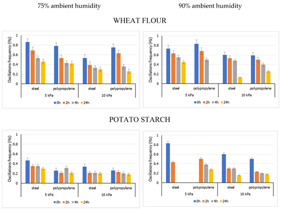 Regardless of the examined powder and the material of the measuring rod, the number of oscillations decreased gradually as the time of consolidation increased. At lower ambient humidity, a significant decrease in the number of oscillations with increasing consolidation load was observed in wheat flour when examined using the steel measuring rod, which was not observed for the rod made of polypropylene. The number of oscillations in samples examined directly after subjecting the consolidation load varied from 30, when the polypropylene rod was used, to 57 for the steel rod at an ambient moisture of 75%. An increase in ambient humidity to 90% resulted in a twofold or nearly threefold increase in the number of oscillations, indicating a strong effect of the water content in the sample on that parameter. These results show that the number of oscillations in wheat flour increases rapidly after a certain threshold value of water content in the sample is exceeded. This is likely due to the presence of additional components in wheat flour, such as proteins, which can interact with adsorbed water [31]. The presence of these components and the lower content of crystalline structures may contribute to the instability of the material during the initial phase of the experiment [20].