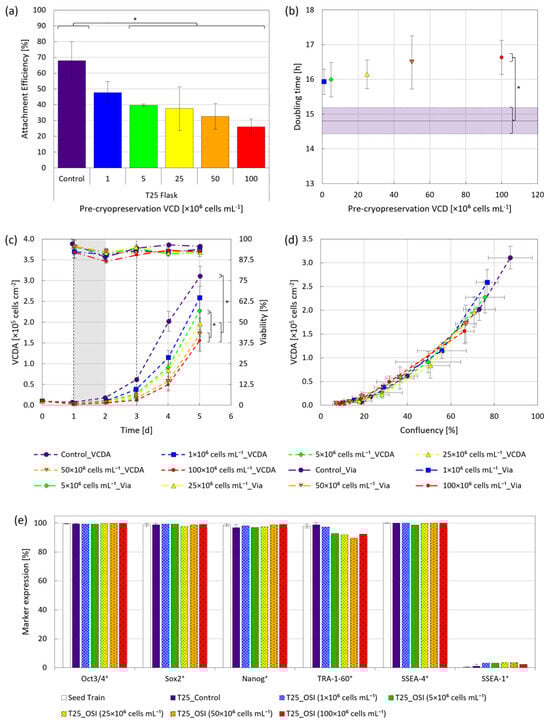 Cell growth under static conditions following cryopreservation at various VCDs. Cells were either routinely passaged (●), or frozen away at VCDs of 1 × 106 (■), 5 × 106 (♦), 25 × 106 (▲), 50 × 106 (▼) and 100 × 106 (•) cells mL−1, thawed and then replated for evaluation. (a) Attachment efficiency 24 h following replating. (b) Doubling time as a function of VCD during cryopreservation, with the horizontal line representing the routinely passaged control. (c) VCDA and viability over a 5 d cultivation period following replating, with vertical black dashed lines indicating intermittent medium exchanges and the grey field indicating the adaptation phase to the removal of RI. (d) VCDA as a function of confluency. (e) Expression of pluripotent markers Oct3/4, Sox2, Nanog, TRA-1-60 and SSEA-4, as well as the differentiation marker SSEA-1 5 d post-inoculation. * p < 0.05.