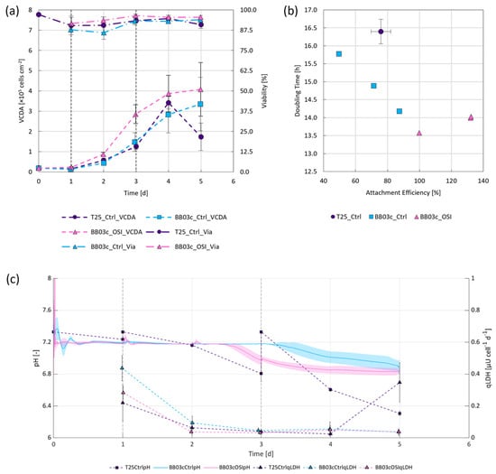 It is widely accepted that static cultivation systems face challenges with regards to their scalability [9,32]. Hence, the compatibility of OSI in combination with a more scalable approach to hiPSC expansion under stirred conditions was evaluated, namely by using spherical Synthemax II coated MCs with a diameter of 125–212 µm and a rigid polystyrene backbone. A comparison of the growth-dependent parameters between the results obtained from the OSI and control BioBLU® cultivations revealed that OSI under stirred conditions improved attachment efficiency (≈50%) and led to slightly better cell distribution on the MCs (≈10%) within the first 24 h following inoculation (Table 1). Considering the reported correlation between attachment efficiency and expansion factor when cultivating pluripotent stem cells on MCs [33], it is unsurprising that this development consistently led to comparable or higher cell densities (≈100%), viabilities (≈8%) and doubling times (≈7%) over the first 2–3 d (Figure 3a,b). OSI also appeared to improve cell survivability within the BioBLU® systems during and following the attachment phase, as substantiated by the lower cell specific LDH activities (≈35%) as shown in Figure 3c.