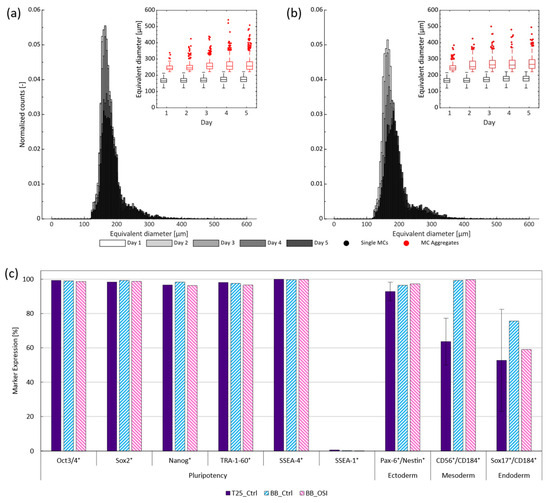 Distribution and change in equivalent MC aggregate diameter over the 5 d cultivation period for the (a) BioBLU controls and (b) BioBLU OSI replicates. Expression of (c) pluripotency (Oct3/4, Sox2, Nanog, TRA-1-60 and SSEA-4) and differentiation (SSEA-1) markers following the harvest of the hiPSCs from either the routinely passaged static T-flask controls (purple), stirred controls (blue), or stirred OSI experiments (pink), as well as their respective germ line specific marker expression following subsequent tri-lineage differentiation.