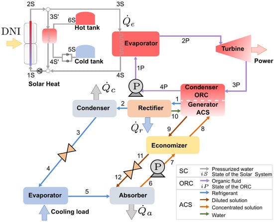 The proposed ORC–ACS is presented in the schematic diagram in Figure 1, where the topping and bottoming cycles represent the ORC and ACS, respectively. In the ORC, the solar heat from the PTSC is supplied to the evaporator, increasing the temperature of the high-pressure stream coming from the pump and, thus, obtaining a superheated vapor at the exit of this component. The organic fluid in this state flows to the turbine, which is expanded to a lower pressure level, producing mechanical power that can be transformed into electricity by an electric generator. At the exit of the turbine, the organic fluid, remaining as a superheated vapor, enters into a closed-type heat exchanger where the power and cooling cycles are coupled. The fluid is condensed by rejecting its condensation heat to the concentrated solution in the generator of the absorption cycle. The organic fluid leaves this heat exchanger as saturated liquid and is pumped to the evaporator, thus closing the power cycle.