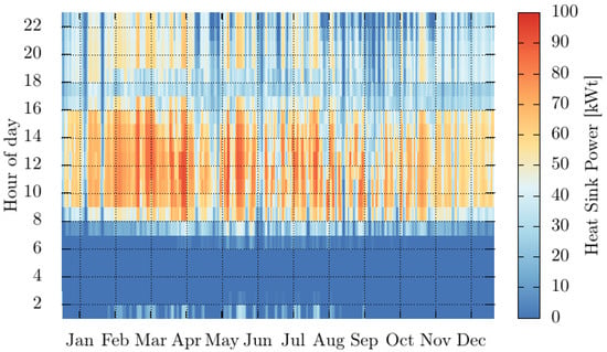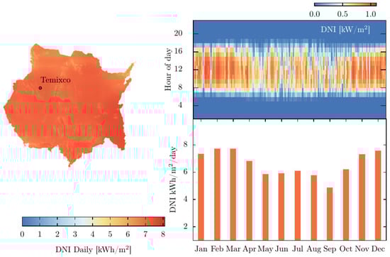 As previously mentioned, the design of the thermal supply to the cooling and power system is based on a parabolic trough model. The solar system is composed of the parabolic trough collector and the storage system; its performance was calculated using the SAM (2022.11.21 version) software, which allows the estimation of techno-economic aspects of renewable energy projects. The main parameters required to carry out the solar system simulation are site location, design point, solar multiple, heat transfer fluid (HTF), thermal storage, design thermal power, and type of parabolic collector. Site selection requires knowledge of the available solar resources; for solar concentration, it is recommended that the site have a direct daily irradiance above 5 kWh/m2 []. The site selected for this project is located in the city of Temixco, Morelos, Mexico, at coordinates 18.8393° N and −99.2354° E. This location experiences a daily irradiance of 6.58 kWh/m2, a value higher than the recommended threshold. The design point parameter is determined by calculating the cumulative distribution of the direct normal irradiance (DNI) of a typical meteorological year (TMY) and selecting the value that represents the 95th percentile of the distribution. For the selected site, this value is 950 W/m2. Figure 2 displays the daily solar energy availability per square meter at the selected site for each month, along with an hourly map illustrating irradiance throughout the year.
