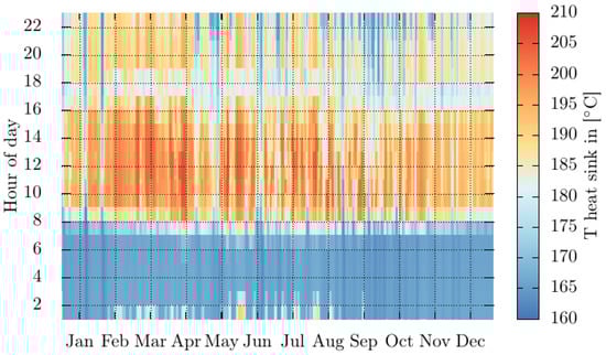 The choice of the HTF depends on the required temperatures. The SAM software allows the selection of various types of HTF, including oils, molten salts, or pressurized water. Considering that the operating temperature range is not extreme, pressurized water is preferred for this model. The temperature range in the model is as follows: the supposed HTF temperature entering the collector is 170 °C, while the expected outlet temperature is 210 °C. According to the simulation results, Figure 3 presents the HTF temperature achieved by the PTSC by hour throughout the year.