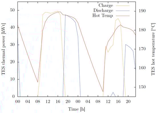 In Figure 3, it is possible to identify the three main periods: a main period, from 8 to 16 h, when the PTSC is the main heat provider to the integrated system but also to the storage system; a secondary period, from 16 to 24 h, when the thermal energy to the integrated system is provided mainly by the storage system; and a third period, from 24 to 8 h, when the HTF temperature is the lowest due to the intermittent behavior of solar energy and the specified capacity of the thermal storage.