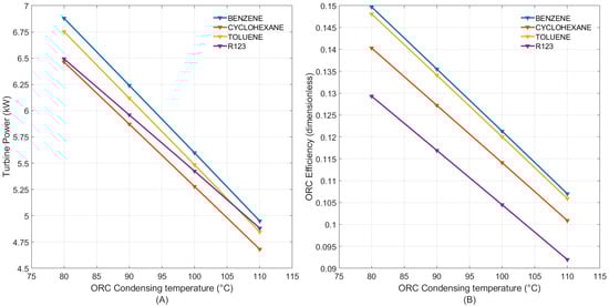 - A wider range of working fluids. Such flexibility enables the optimization of the cycle for specific heat source temperatures. Recent research on organic fluids has addressed issues like their thermodynamic performance [], actual greenhouse effect [,], the use of zeotropic mixtures as working fluids [,,,,], and the effect of using super dry working fluids on system performance [,].