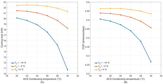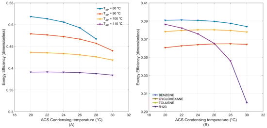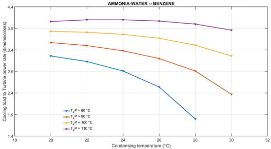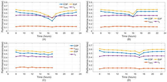 In Equation (42), temperatures are expressed in the thermodynamic scale, and a difference of 10 °C is added to the lowest and highest temperatures of the integrated cycle to consider that cooling and heating are related to external heat sources. In this equation, the numerator represents the exergy of the cooling load and power produced, while the denominator is the sum of the exergy of the work and heat supplied to the integrated system in the pumps and in the ORC evaporator.