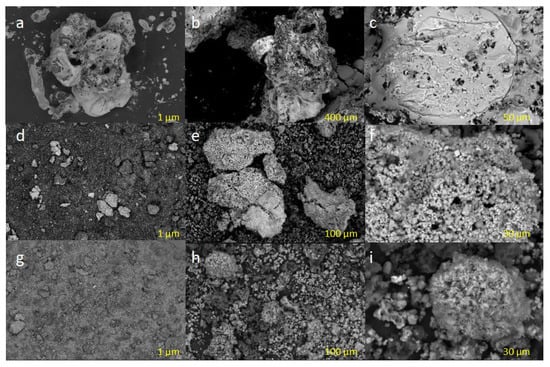 The porosity development of the hydroxide-treated samples is evident from the SEM images. It is clearly seen that the microstructure of both activated carbons is granular with a relatively narrow particle size distribution (e, f, h, and i), whilst the microstructure of untreated char is non-porous (a–c). Another notable observation is that the activated samples developed a randomly dispersed roughness on the surface, which was manifested by the huge increase in the surface area compared to the untreated char (Table 3). Meanwhile, the KOH-activated sample exhibits a more porous structure and a denser porous network compared to the NaOH-treated sample, i.e., f vs. y, which can be attributed to the larger agent/precursor ratio of the former sample. Probably, the larger agent/precursor ratio promoted the formation of more pores and expanded the porous network through various chemical reactions between KOH and carbon species during the activation process []. Therefore, the morphology analysis evidenced that hydroxide activations create a porous network on the carbon surface, which is consistent with the textural properties discussed above. The development of these surface structures impacted their CO2 adsorption capacity.