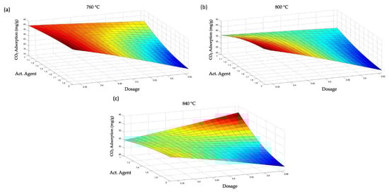 Response surfaces as a function of the activated conditions at (a) 760 °C, (b) 800 °C, and (c) 840 °C.