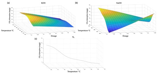 The adsorption capacity of the samples activated with KOH at the highest ratio (0.66) was not significantly affected by the activation temperature. The maximum adsorption point was observed at 800 °C for the samples activated with a ratio of 0.37. The CO2 adsorption capacity of the NaOH-activated samples varied greatly with temperature. For example, the maximum CO2 adsorption was observed at temperatures below 780 °C, and the adsorption capacity decreased significantly as the activation temperature increased. An opposite behavior was observed for the samples activated at a ratio of 0.6, as the maximum adsorption points corresponded to the highest activation temperature (Figure 4b). Finally, the response surface for the physically activated samples (N2) is presented as a 2D plot (Figure 4c), where only the activation temperature was monitored. The CO2 adsorption capacity decreased with increasing the activation temperature, reaching the maximum adsorption point at the lowest activation temperature, i.e., 760 °C.