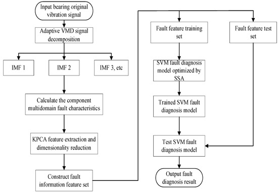 The signal processing and feature extraction models were constructed using the adaptive parameter VMD-KPCA method, and the detailed process of SVM optimization with SSA algorithm was developed. Therefore, the established fault diagnosis model is shown in Figure 2.