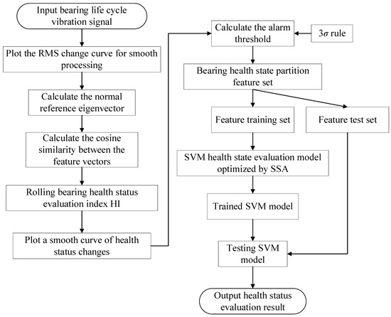 - Input the test set samples into the trained SSA-SVM to realize the evaluation of different health states of rolling bearings.