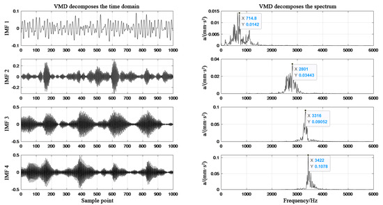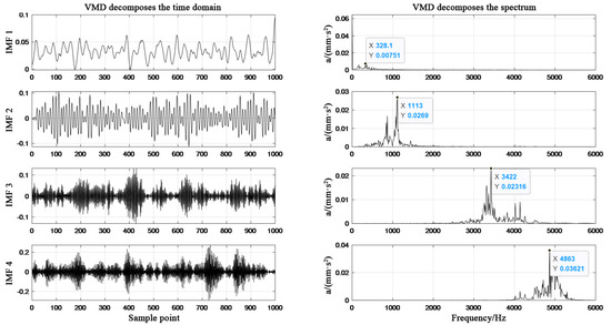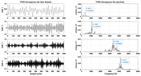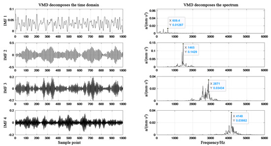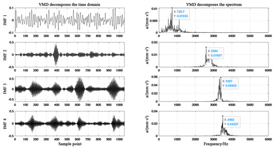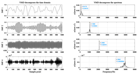 SSA is used to optimize the decomposition level k and penalty factor α in VMD, where the value range of k and α is [2, 10], [200, 4000], the population size is set to 30, the maximum iteration number is set to 40, and the optimal value of vibration signal samples is tested for 5 times. VMD initialization parameters, the convex function optimization parameter τ is 0, the first center frequency update parameter DC is 0, the center frequency initialization parameter init is 1, and the precision parameter ε is 10−7. The decomposition results of adaptive VMD decomposition diagram in four running states are shown in Figure 4, Figure 5, Figure 6 and Figure 7. The y-axis of the VMD decomposition diagram is the amplitude of the vibration signal.