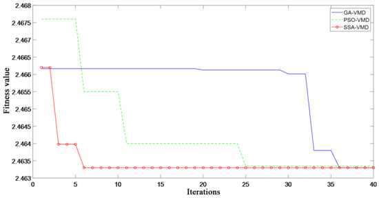 In order to more intuitively reflect the excellent performance of the SSA algorithm, the fitness curves of the three algorithms using the outer ring fault data to optimize VMD parameters were compared, as shown in Figure 10. As can be seen from the figure, SSA-VMD, PSO-VMD and GA-VMD converge in the 6th, 25th, and 36th generations, respectively, and SSA-VMD converges faster. Although all tend to the fitness value of 2.463 in the end, SSA-VMD has the smallest fitness value, which is 2.4633, but also reflects the advantages of its high convergence accuracy.
