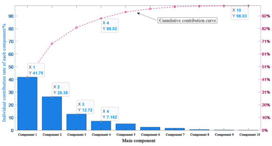 Although the cumulative contribution rate of component in Figure 11 is close to 100%, it does not reach 100% in practice, only the top 10 fusion features are shown, and there are still fault features with a small contribution rate. It can be seen from the figure that the cumulative contribution rate of the first four principal component fault feature components is 88.02%, which exceeds the cumulative contribution rate of 85% specified above, and can represent the vast majority of fault characteristics. The multi-domain fault feature can be reduced from 30 to 4 dimensions by sacrificing the component with very small contribution rate, thus achieving the effect of improving the calculation speed.