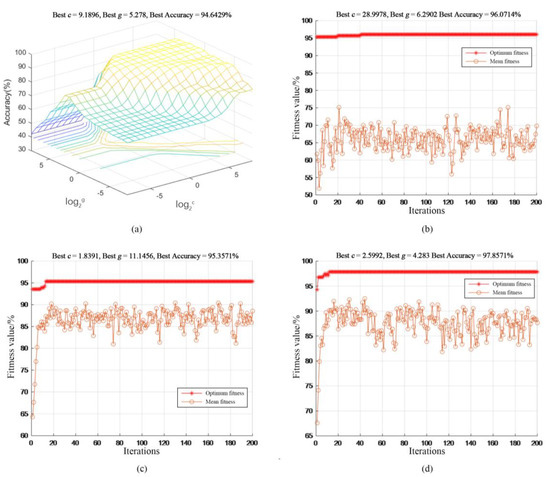 SVM parameter optimization process. (a) Unoptimized SVM parameter selection results. (b) PSO-SVM parameter optimization process. (c) GA-SVM parameter optimization process. (d) SSA-SVM parameter optimization process.