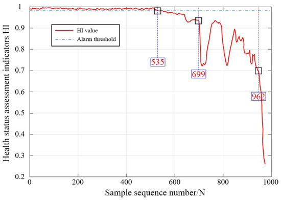 According to the method constructed above, the RMS value is transformed into the health status evaluation indicator HI, and the mean and variance of the first 200 samples are calculated to obtain the fault alarm threshold. Finally, the change curve of HI value is drawn, as shown in Figure 15.