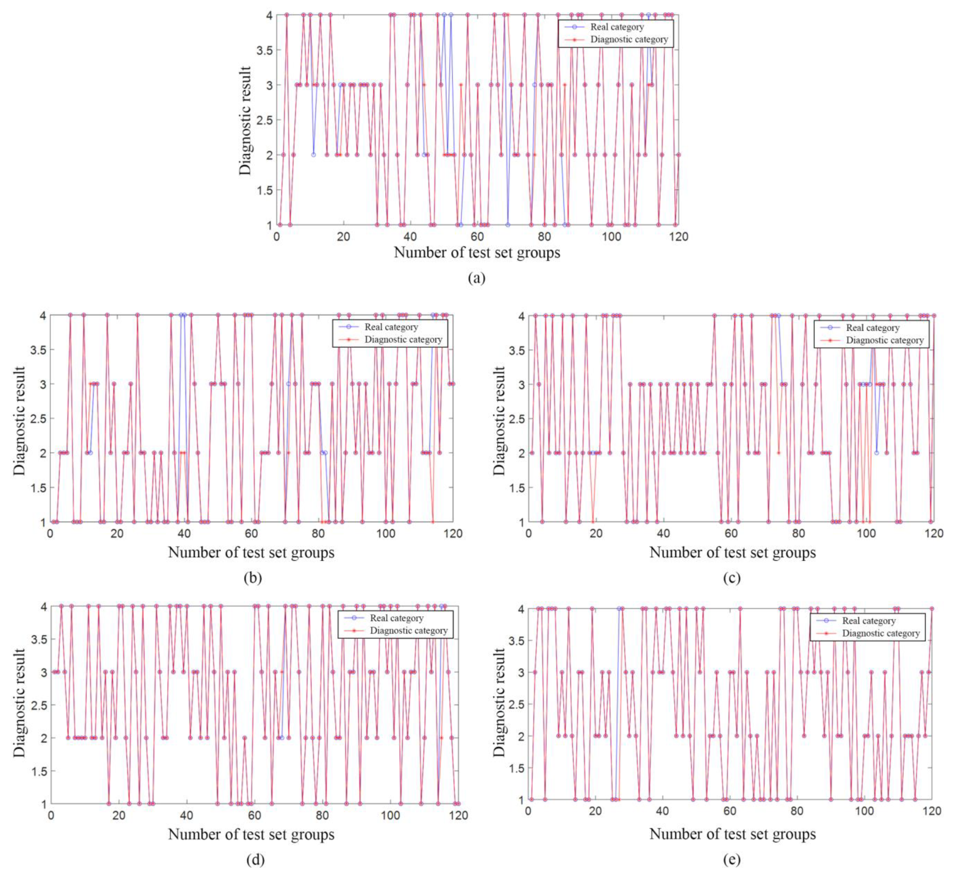 Fault diagnosis results of the diagnostic model. (a) Unoptimized SVM fault diagnosis results. (b) GA-SVM fault diagnosis results. (c) PSO-SVM fault diagnosis results. (d) SSA-SVM fault diagnosis results. (e) SSA-SVM fault diagnosis results without KPCA.