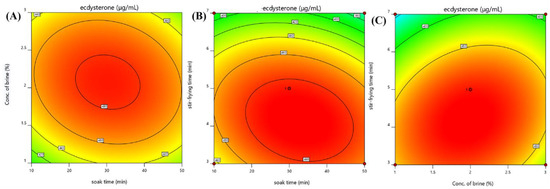The real and predicted mean concentrations of ecdysterone under repeatability conditions are shown in Table 3. The experimental values of the concentration of ecdysterone were calculated at 491.79 μg/mL. No significant difference (p < 0.05) was observed between the theoretical and experimental responses. The optimal conditions are as follows: soak time: 29 min; concentration of brine: 1.8%; stir-frying time: 4.4 min.