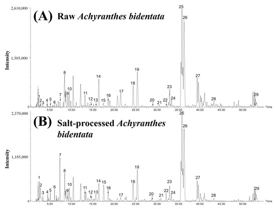 HPLC–Q-TOF-MS total ion chromatograms of raw and salt-processed Achyranthes bidentata. (A) raw Achyranthes bidentata; (B) salt-processed Achyranthes bidentata.