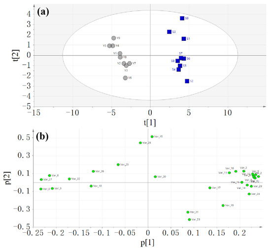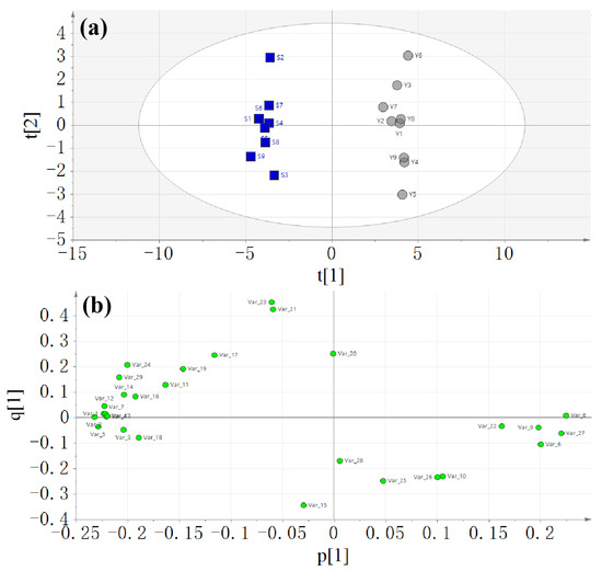 Score plot (a) and loading plot (b) of the OPLS-DA model.