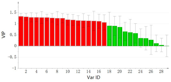 VIP plot of the OPLS-DA model. red indicated VIP value > 1,green indicated VIP value < 1.