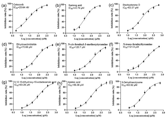 IC50 curves of celecoxib and other compounds. (a) celecoxib, (b) sanleng acid, (c) stachysterone, (d) dihydroactinidiolide, (e) N-cis-feruloyl-3-methoxytyramine, (f) N-trans-feruloyltyramine, (g) 9, 12, 13-trihydroxy-10-octadecenoic acid, (h) azelaic acid, and (i) dehydroecdysone.