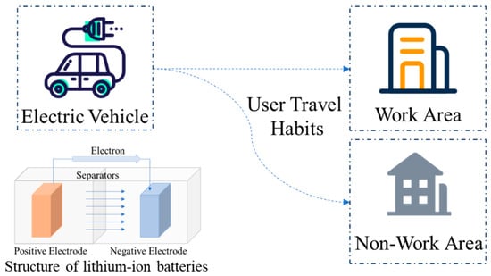 Based on the analysis, we observe that many scholars have conducted research related to operational strategies for EVs. With the growing popularity of EVs, many businesses have started to use EVs owned by their employees as mobile energy storage units, integrating them into the company’s own electricity usage. As shown in Figure 1, the destinations of EVs consist of working and non-working areas. According to user travel data, users within a company have similar habits when using EVs. At present, lithium-ion batteries are the mainstream batteries for EVs, mainly composed of a positive electrode, negative electrode, electrolyte, and separator. This type of battery achieves energy storage and release through the insertion and removal of lithium ions and is widely used in EVs, smartphones, laptops, and other fields. How to consider the interrelated dynamics among businesses, operators, and EV users, and how to optimize the operation of EV charging and discharging strategies to reduce the corporate cost of purchasing electricity has become a current hot topic of research. Therefore, the main contributions of this paper are as follows: