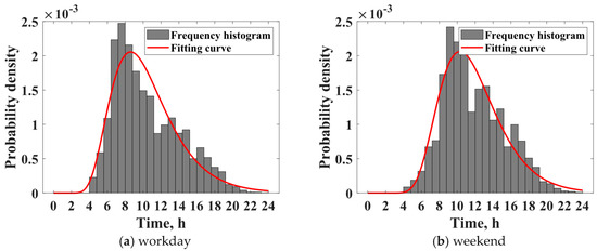 In order to fit the probability distribution model of the first travel start time, we tried all of the distribution models mentioned above and obtained the fitting accuracy when using different models according to the determination coefficient and adjusted determination coefficient in Equations (1) and (2). Finally, the Inverse Gaussian model is used to fit the probability distribution of the first travel start time, as shown in Figure 3, and its probability density function is shown in Equation (3):