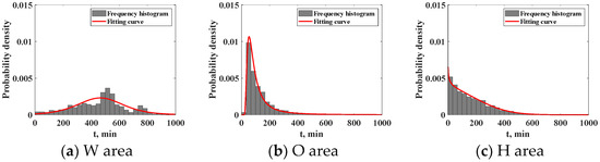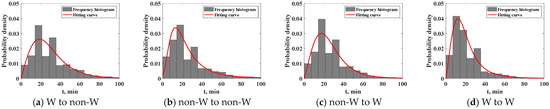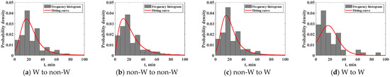 Depending on the type of place in the dataset, it can be divided into W (for working area), H (for home/residential area), and O (for other area). This paper mainly considers the vehicle track passing through the working area, so the driving type is divided into working area and non-working area (H and O areas). Based on location (two types of starting areas/two types of ending areas) and day type (workday/weekend), driving time of vehicles is classified into eight categories. The probability distribution model for eight types of driving time is shown in Table 1 and Figure 4 and Figure 5.
