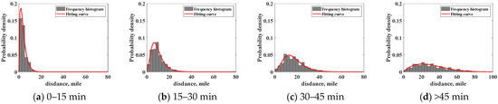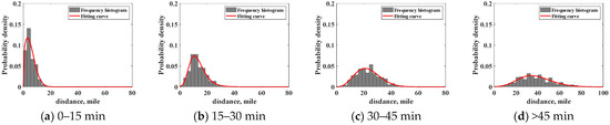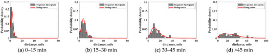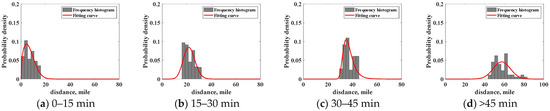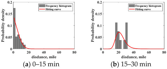 Consider the driving distance d as a probability distribution that follows the condition of driving time. Driving distance and driving time are classified in the same way, and are classified into eight categories. According to the driving time, the driving distance under each type is divided into four time windows, which are 0–15 min, 15–30 min, 30–45 min, and more than 45 min. The normal distribution is used to fit the eight types of driving distances in the i time window. The probability distribution of driving distance is shown in Table 3 and Figure 8, Figure 9, Figure 10, Figure 11, Figure 12, Figure 13, Figure 14 and Figure 15. The conditional probability density function is shown in Equation (4):