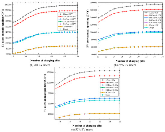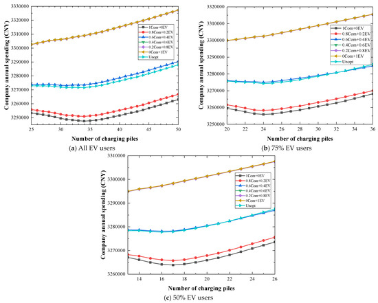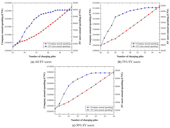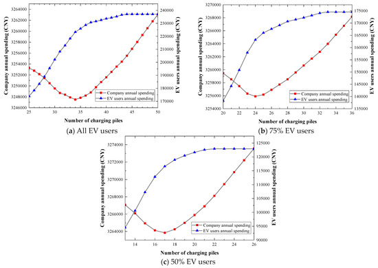 It is known that the expenses of the company consist of regular load electricity costs, discharge subsidies for EV users, charging service fees collected from EV users, and investment costs for charging piles. The participation of EV users can be categorized into full participation, 75% participation, and 50% participation. By minimizing the company’s spending objective function, we can establish a relationship between the annual spending of the company and the number of charging piles as depicted in Figure 16.