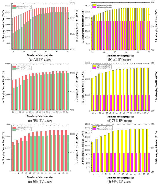 The charging service fees and the discharging subsidies for EVs under the two objective functions are shown in Figure 18. Here, Group A represents the results considering only the company’s costs, while Group B represents the results considering only EV users’ costs. From the figures, it is evident that when only user interests are considered, Evs do not frequently participate in the company’s charging and discharging scheduling. It can also be observed from the EV discharging subsidies in Group B, which show no significant fluctuation with the increase in the number of charging piles. Therefore, it can be inferred that when only considering the interests of EV users, without altering the electricity market prices and the vehicle charging and discharging prices, the willingness of EV users to participate in electricity scheduling remains unchanged.