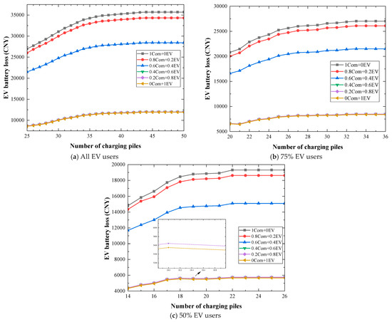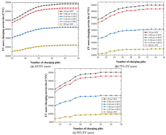Figure 19 and Figure 20 show the variation in costs for the company and EV users with the number of charging piles under objective functions with different weights. Through analysis of the figures, when the EV users’ costs are dominant in the objective function, both the annual costs for the company and the annual costs for EV users exhibit the same trend and almost equal values. This is because in the scenario where EV users’ costs are predominant, the charging and discharging scheduling strategies are essentially consistent, that is, minimizing battery degradation, only undertaking necessary charging, and participating in limited discharging plans. Also, since the electricity market prices remain constant, there are no additional incentives to motivate EV users to change this behavior.