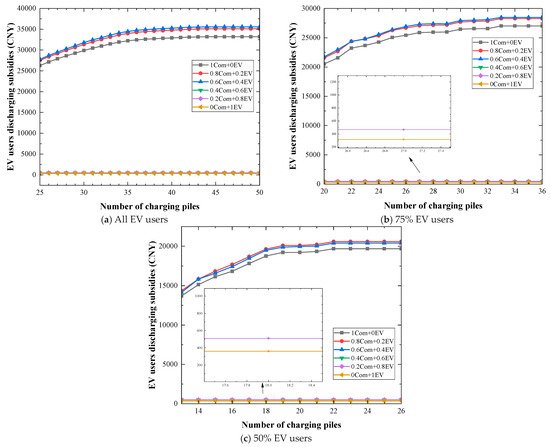 As can be seen from Figure 16a, when the quantity of charging piles reaches 34, the company’s annual spending is the smallest. When the quantity of charging piles is less than 34, the more charging piles, the less the annual spending of the company. This is because, at this stage, the company’s revenue comes from collecting service fees paid by EV users, as well as using the low-cost electricity emitted by EVs during peak tariff periods. When the quantity of charging piles exceeds 34, the company’s annual fee increases with the quantity of charging piles. This is because the cost of investing in charging piles exceeds the charging service fees charged. As the quantity of charging piles increases, the total annual cost for EV users begins to grow rapidly and then levels off. This is because when the number of charging piles reaches a certain level, the number of vehicles that can be served increasingly approaches the total number of vehicles parked in the company’s parking lot. When the quantity of charging piles is greater than or equal to 44, the total annual cost of EV users remains unchanged and no longer increases with the increase in the quantity of charging piles. This is because the maximum number of vehicles in a typical day is 44, indicating that the number of charging piles is already sufficient to meet the charging/discharging needs of all vehicles.