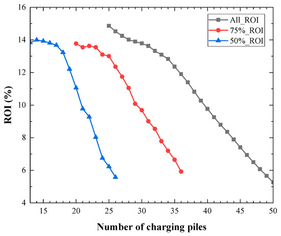 Investment return rate is a way to measure the economic return that a company receives from investment activities. The return on investment for the company in charging piles is shown in Equation (24). The company’s profit is the difference between the cost without installing charging piles and the cost with installing charging piles, where the cost without installing charging piles consists only of the company’s regular load electricity charges. The change in the company’s return on investment with the variation in the number of charging piles is shown in Figure 24. As the number of charging piles increases, the company’s return on investment decreases. This indicates the need to find a balance between the company’s return on investment and the annual expenditure of EV users, so that both the company and EV users can achieve good returns.