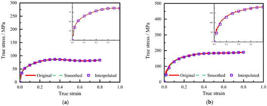 Comparison between the pre-processing results of experimental rheological data and the original data under temperature of 1000 °C with a strain rate of (a) 0.01 s−1 and (b) 10 s−1.