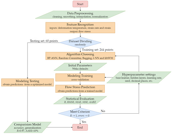 Due to the output parameter being numerical, a regression model with high predictive capability should established. In terms of evaluation metrics, predicted results of the model should exhibit a high correlation coefficient and low root mean square error, among other metrics that will be introduced later. Machine learning algorithms such as back-propagation artificial neural network (BP-ANN), Random Committee, Bagging, k-NN, and libSVM were chosen to predict flow stress in this paper. The above-mentioned machine learning algorithms were implemented by Weka 3.9.6 [43,44]. Random Tree derived from the decision tree algorithm was selected as the base learner for Random Committee and Bagging in this paper, with the seed of 2, the decimal places of 5, and the K value being the default value of Weka. The hyperparameter settings were a reasonable selection, tuning, and combination based on considering the prediction accuracy and generalization of the above machine learning models. To enhance the predictive ability of machine learning algorithms, a 10-fold cross-validation method was used to evaluate the models [45]. Flow chart of the model training and evaluation process is shown in Figure 3, and the characteristics and specific implementation settings of each algorithm are introduced as follows.
