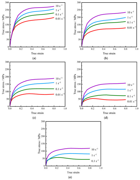 True stress–strain curves of the Ni-Cr-Mo steel compressed under various deformation conditions: (a) 800 °C; (b) 900 °C; (c) 1000 °C; (d) 1100 °C; (e) 1200 °C.